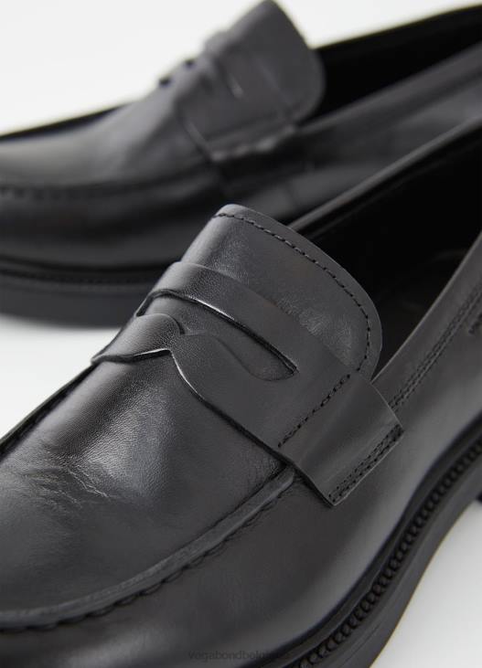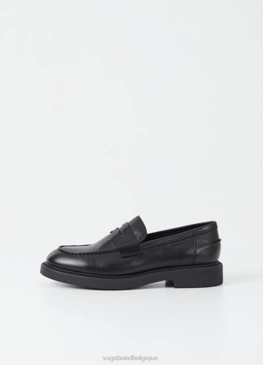 alex w est le mocassin penny de tous les jours confectionné en cuir noir lisse avec des détails moc-toe, des orteils en forme d'amande et une fente penny traditionnelle sur l'empeigne. le style moderne repose sur des semelles extérieures en caoutchouc solide mesurant 33 mm. les détails incluent des coutures visibles le long des semelles extérieures.